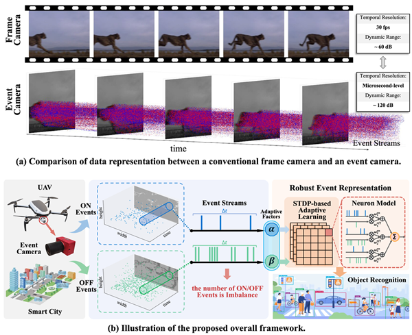 在无人机快速飞行中,传统帧式相机(Frame Camera)由于受限于帧率和成像方式,常面临运动模糊与曝光异常等问题。近年来,事件相机(Event Camera)作为一种新型视觉传感器,凭借其微秒级时间分辨率和高动态范围,可异步捕捉像素级亮度变化,成为应对高速动态场景感知挑战的潜在技术方案。为此,本研究提出了一种基于自适应脉冲时序依赖可塑性机制(STDP)的事件表征学习方法,有效缓解正负事件数据极性不均衡带来的影响,提升了运动目标的识别精度,为无人机目标感知提供了新的端-云协同感知方案。