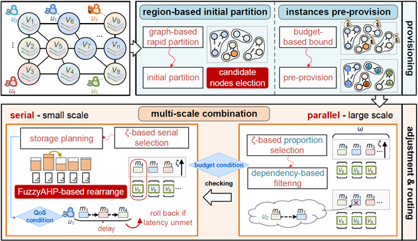 在云计算与5G深度融合的新型信息基础设施建设浪潮中,边缘计算成为推动算网融合演进的关键技术路径。微服务架构因其弹性与模块化优势广泛应用于边缘智能场景,但在实际部署中仍面临请求分布动态性强、服务链依赖复杂与资源受限等挑战。为此,SoCL 框架聚焦“高效部署、动态感知、多目标调度”三大关键技术,构建了从服务划分、实例预部署到跨区域联合路由的系统级联合优化方案。具体而言,SoCL框架由三阶段组成:第一阶段基于用户访问区域和微服务链依赖结构,进行图划分与候选节点选择,确保服务划分的空间感知性;第二阶段引入预部署机制,结合成本约束和访问热度提前布局服务实例;第三阶段构建串并行融合的多尺度组合策略,结合延迟反馈、依赖剪枝等机制,实现高效路由与调度。大量真实数据集验证结果表明,SoCL相较现有主流基线方法,在响应时间和资源利用率方面均表现出显著优势,且在极端负载等复杂场景下依然能够实现高精度、低开销的调度部署,展现出优越的稳健性与实用性。