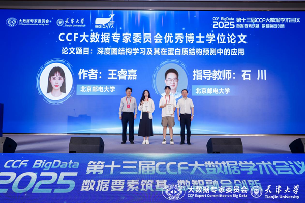 2025年9月12日至14日,第十三届CCF大数据学术会议在天津成功举办。作为我国大数据领域最具影响力、规模最大的高水平学术会议之一,本届盛会吸引了超过800名专家学者、产业界人士及研究生参会。会议期间,2025年度“CCF大数据专家委员会博士学位论文激励计划”评选结果正式揭晓,中国电信云计算研究院研究员王睿嘉博士凭借其博士学位论文《深度图结构学习及其在蛋白质结构预测中的应用》成功入选,成为首届全国唯一获此殊荣者。