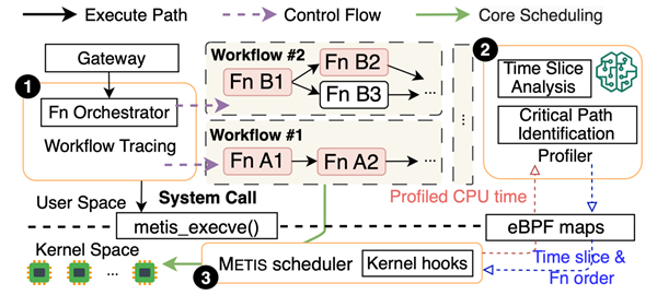 为解决这一难题,研究团队提出了一种针对Serverless工作流的操作系统级调度器——Metis。与传统调度器不同,Metis将工作流视为一级调度实体,通过“工作流感知最少服务时间”(WLAS)算法,动态优化调度决策,优先处理关键路径任务,减少阻塞延迟,从而显著提升端到端性能。Metis无需预知工作流的具体结构或任务执行时间,而是通过追踪工作流级虚拟时钟和关键路径估计实现高效调度。此外,Metis采用了轻量化设计,通过eBPF技术动态集成到现有操作系统中,避免了大量系统级改动,具有良好的适配性和部署灵活性。实验结果表明,Metis在多种场景下均表现出较好的性能,改善了平均工作流完成效率,降低了尾延迟,同时在高并发和动态环境下展现了更强的公平性和稳定性。