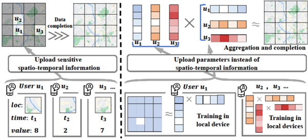 在智慧城市建设中,移动群智感知通过调动大众移动设备收集城市温度、空气质量、交通流量等环境数据,为环境监测、交通调度和城市治理提供重要支撑。然而,由于用户参与度不稳定、设备覆盖不均匀等因素,采集数据往往具有空间稀疏、时间不连续的特点,缺失值补全成为必不可少的技术环节。传统数据补全方法大多依赖向服务器上传用户的原始时空位置与数据记录,但这类信息极易泄露个人出行规律,带来严重隐私风险。因此,在准确数据补全与个人隐私保护之间取得平衡,一直是学界与产业界亟待解决的难题。
