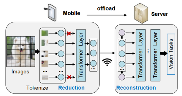 针对上述痛点,该论文提出Mercury框架,构建“移动端高效修剪,云端轻量重构”的端云协同新范式。其核心创新包括:一是相似性驱动的区域分散token修剪技术,在移动端ViT初始层单轮大规模修剪,仅保留各图像区域语义代表性最强的token,减轻端侧负担;二是元参数驱动的低开销token重构技术,在云端以轻量化方式恢复语义特征,避免引入复杂开销。